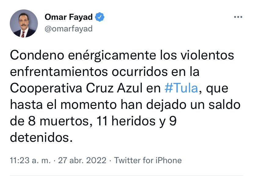«Condeno enérgicamente los violentos enfrentamientos ocurridos en la Cooperativa Cruz Azul en Tula, que hasta el momento han dejado un saldo de 8 muertos, 11 heridos y 9 detenidos», indicó el mandatario estatal en su cuenta personal de Twitter.