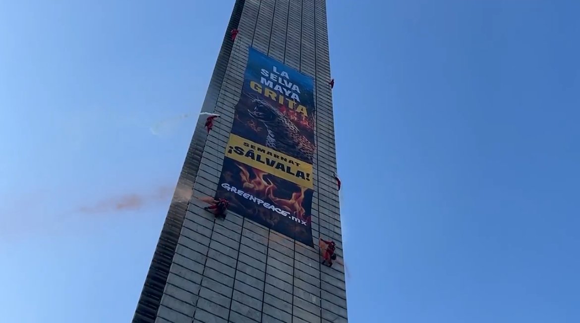 La mañana de este martes, un grupo de activistas escaló la Estela de Luz para colocar a 70 metros de altura una manta en contra de la destrucción de la selva maya y al mismo tiempo hacer conciencia entre los ciudadanos.