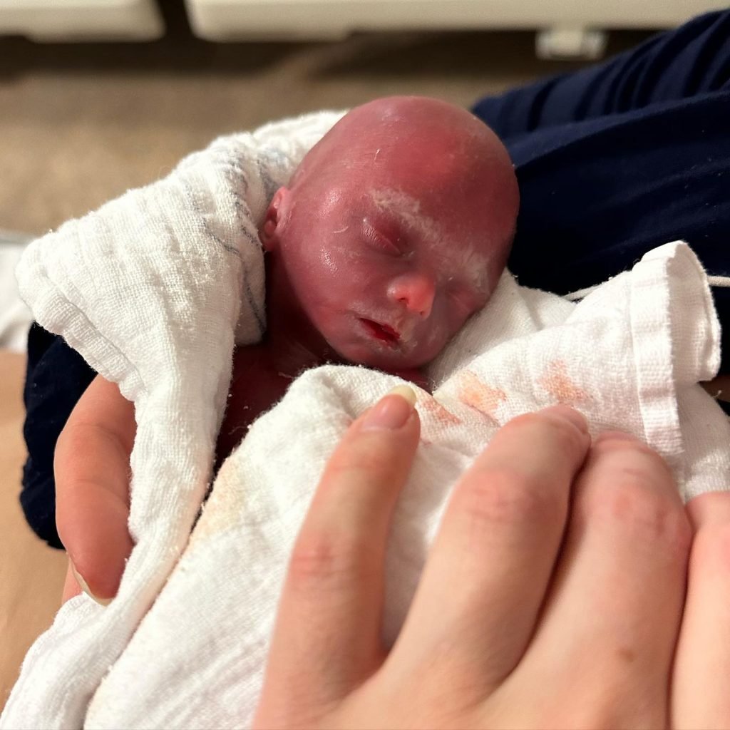En la primera foto aparece él aparentemente llorando junto a su esposa, quien se encuentra recostada en una cama de hospital, en la segunda foto, Kelsey sostiene a la pequeña bebé con sus manos, no se alcanza a ver su rostro ya que se encuentra envuelta en una diminuta frazada.
