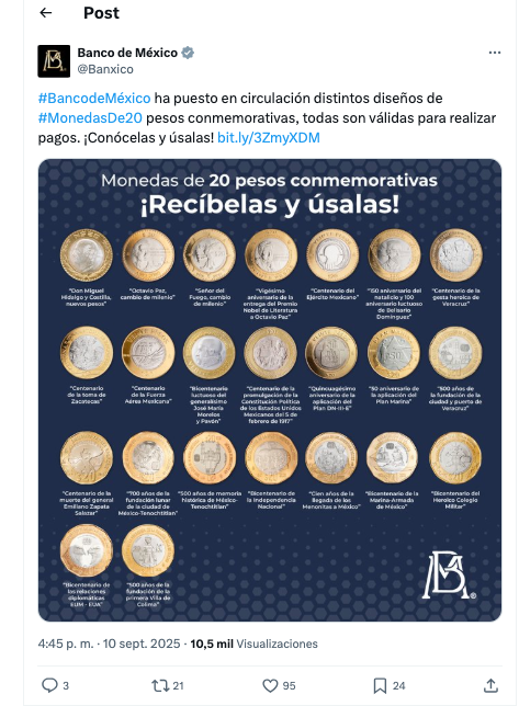En su lugar, Banxico impulsa la moneda conmemorativa de 20 pesos y promueve el uso del nuevo billete de la familia G, emitido en 2021 para celebrar el Bicentenario de la Consumación de la Independencia.