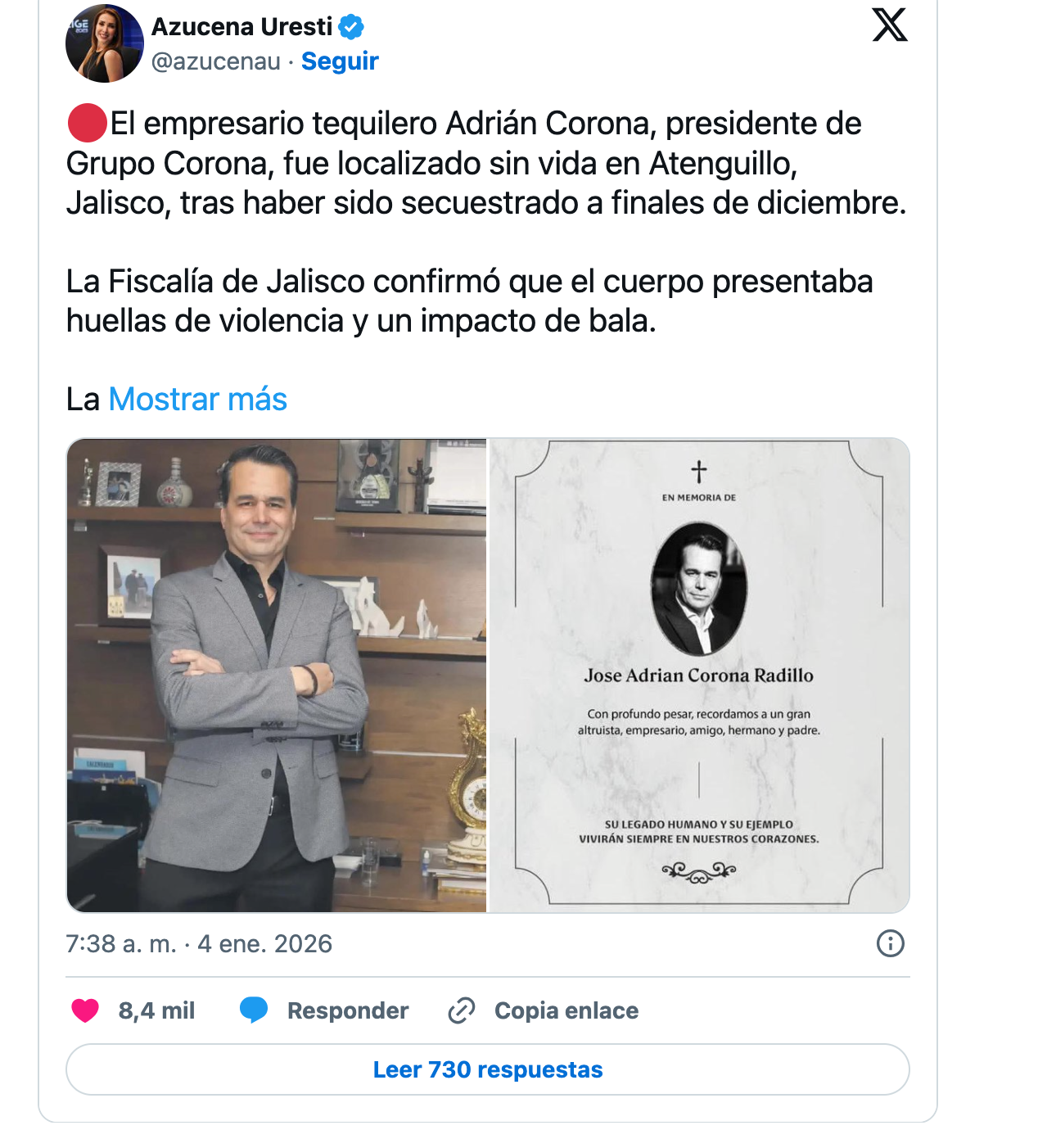 En la mañana de este domingo 4 de enero de 2026 se reportó el hallazgo sin vida de Adrián Corona, empresario tequilero y presidente de Grupo Corona, quien había sido secuestrado previamente cuando viajaba por carretera en la región Costa–Sierra Occidental, en el estado de Jalisco.