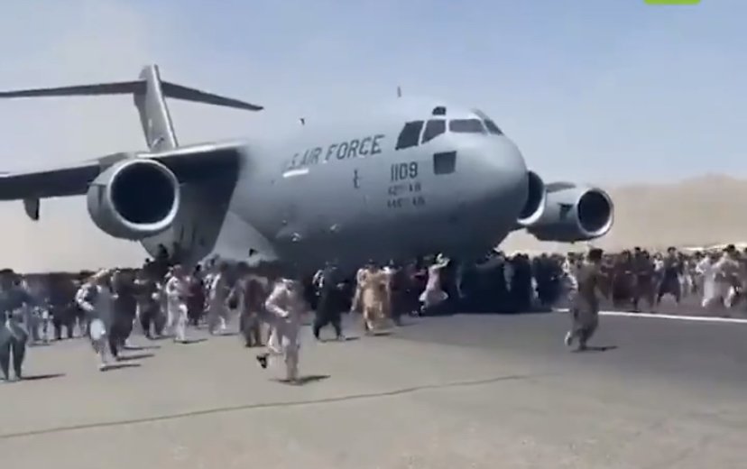 En una escena que representa la desesperación que actualmente viven los afganos, se puede ver como un grupos de varias personas tratan desesperadamente de subir a una avión Hércules de la Fuerza Aérea de Los Estados Unidos que maniobra en un aeropuerto de Kabul, en un intento desesperado por huir de Afganistán por el terror de vivir bajo el yugo de los Talibanes que ya tomaron el control del país.