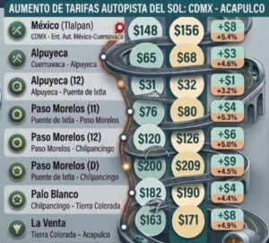 Asimismo, la caseta de Palo Blanco pasó de 182 a 190 pesos, mientras que La Venta, en el tramo final hacia Acapulco, subió de 163 a 171 pesos. En conjunto, el total del tramo carretero CDMX Acapulco pasó de 640 a 670 pesos, es decir, 30 pesos más únicamente en casetas.