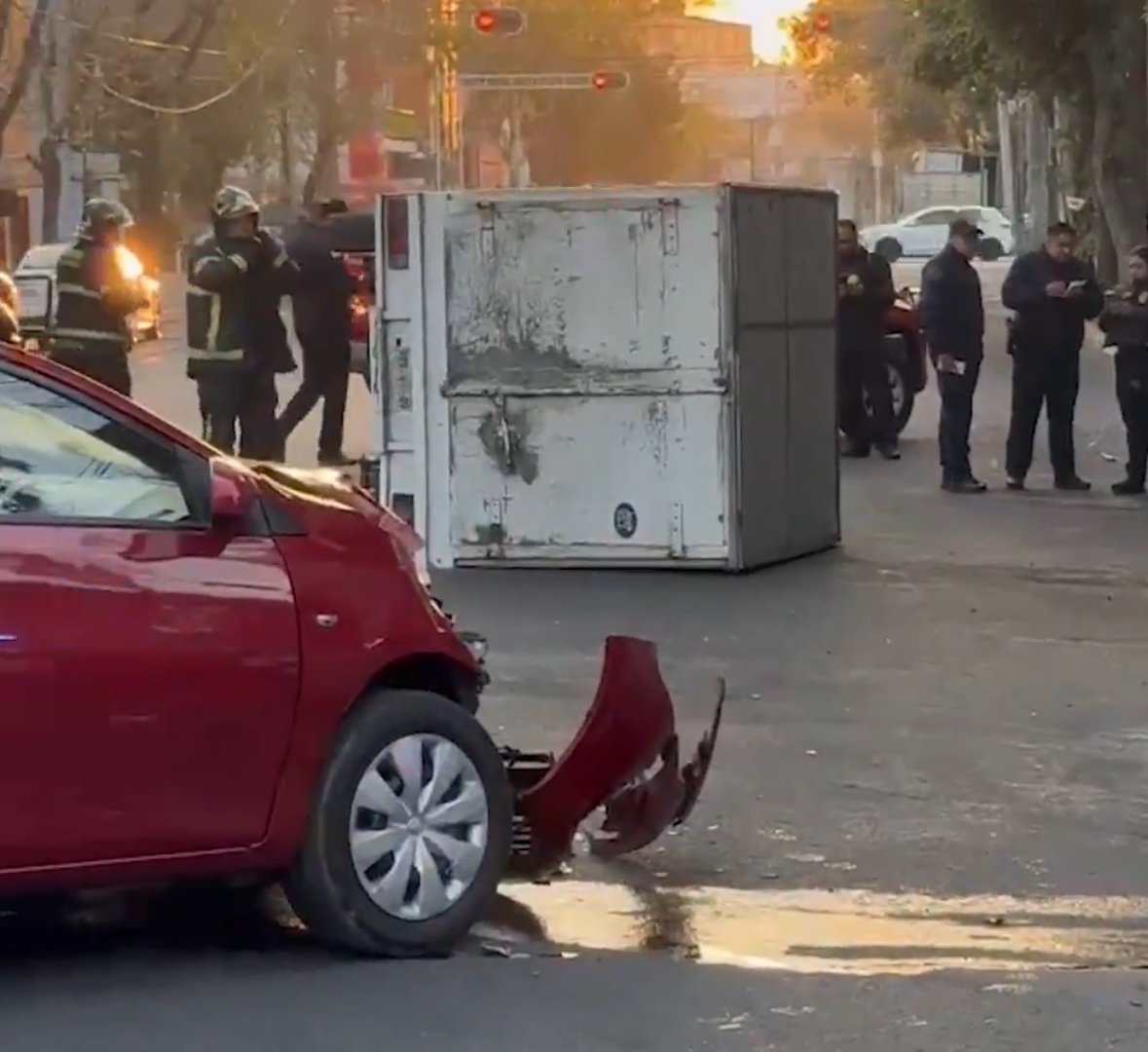 Una camioneta de carga se volcó luego de impactarse contra un vehículo particular cuando circulaban sobre la calle Juventino Rosas, al cruce con la calle Ernesto Elorduy, en la colonia Peralvillo, alcaldía Cuauhtémoc de la Ciudad de México.