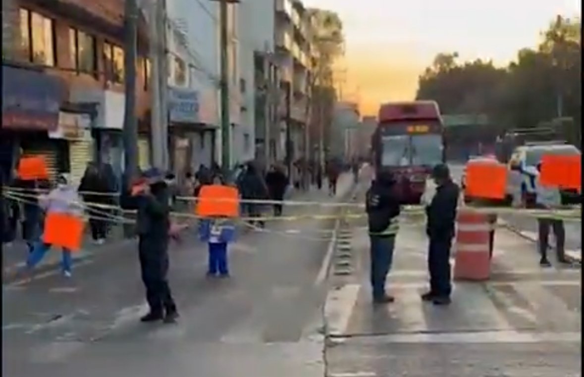 Un grupo de vecinos de la colonia Granjas, realizan un bloque vial sobre el Eje 4 Sur esquina con el Circuito Interior Río Churubusco, en la alcaldía Iztacalco de la Ciudad de México, por lo que además del caos vehicular, están afectando el servicio de la Línea 2 del Metrobús.