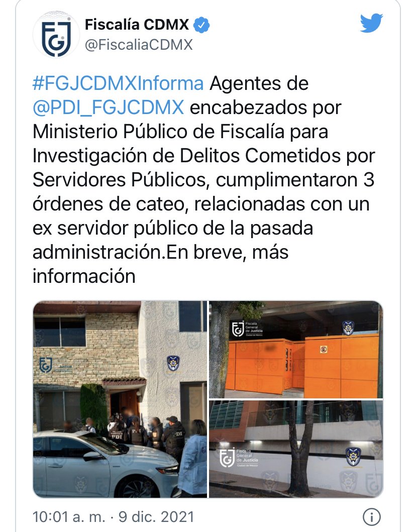 Los cateos, se dijo, fueron realizados por elementos de la Policía de Investigación de la Fiscalía de la CDMX y el Ministerio Público de la Fiscalía para investigación de Delitos Cometidos para Servidores Públicos.