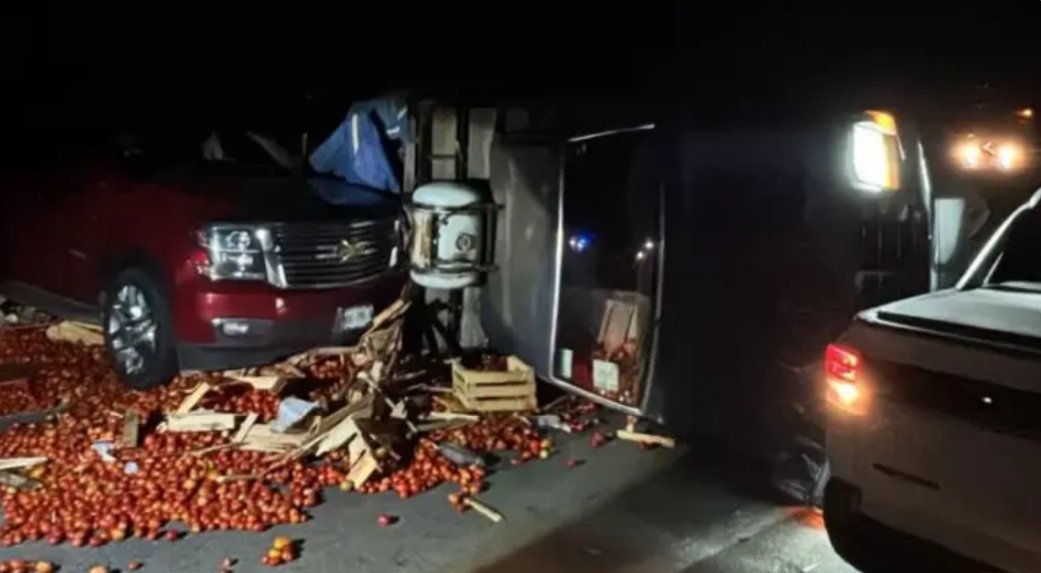 De acuerdo con reportes preliminares, en el accidente estuvo involucrada una camioneta que transportaba jitomate, cuya carga quedó esparcida sobre la carpeta asfáltica, complicando aún más el tránsito en la zona.