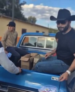 La caravana navideña, encabezada por Pepe Aguilar, Ángela Aguilar y otros integrantes de la famosa familia de músicos mexicanos, recorrió las calles con varias camionetas cargadas de juguetes que fueron repartidos directamente a los pequeños.