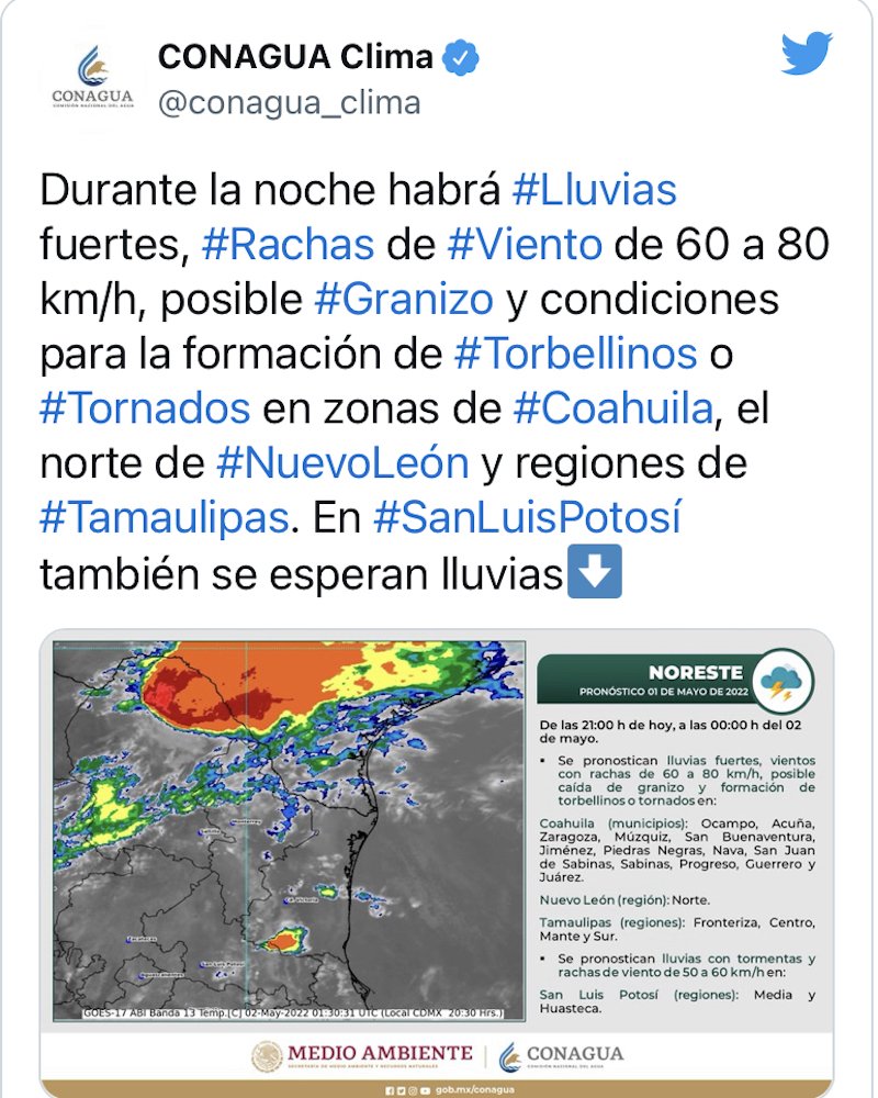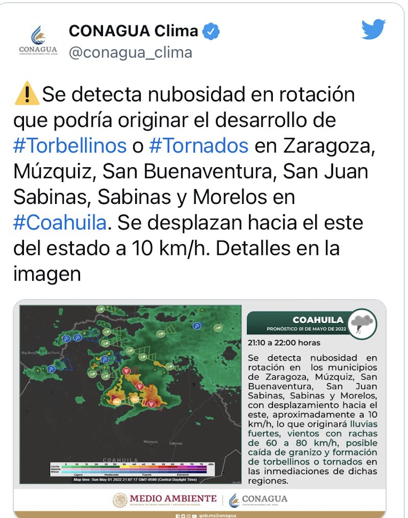 Hay condiciones para la formación de torbellinos o tornados en zonas de Coahuila, el norte de Nuevo León y regiones de Tamaulipas, así lo alertó la Comisión Nacional del Agua (Conagua) por medio de un boletín, mediante el cual la dependencia detalló que se esperan en dichas zonas lluvias fuertes, rachas de viento y posible granizo.