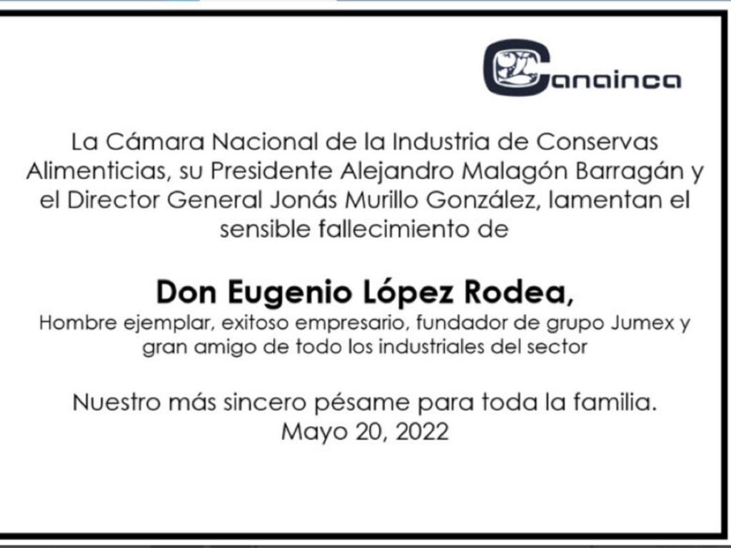 La mañana de este viernes 20 de mayo se confirmó la noticia de la muerte de Eugenio López Rodea, fundador de la empresa de jugos mexicanos Jumex.