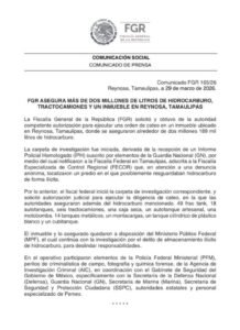 Se explicó que la Fiscalía General de la República obtuvo autorización para ejecutar una orden de cateo en un predio de Reynosa derivado de una denuncia anónima en la que se alertó de un predio que posiblemente resguardaba hidrocarburo de manera ilícita.