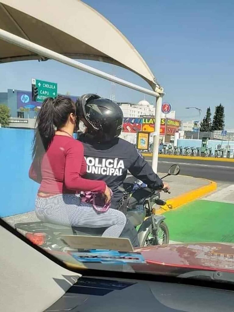Un policía municipal de Puebla fue captado en pleno romance con una mujer arriba de una motocicleta, la foto se volvió viral y generó polémica.