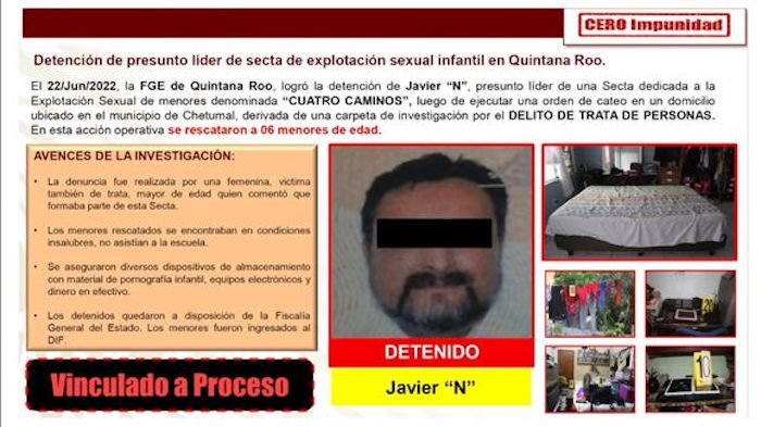 La detención se habría realizado en la tarde del pasado martes 22 de junio, en una casa de la colonia Flamboyanes, en la ciudad de Chetumal. Entre los avances de la investigación, el subsecretario de Seguridad y Protección Ciudadana (SSPC) señaló que la denuncia fue realizada por una fémina mayor de edad, víctima de trata y quien comentó formaba parte de la secta.