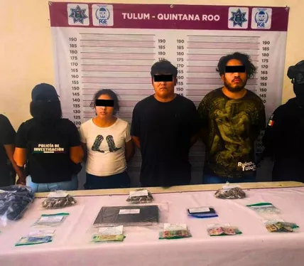 De acuerdo con el comunicado oficial, los detenidos fueron identificados como Cruz Alberto “N”, Pablo Silvino “N” y Adilene “N”, quienes fueron asegurados en flagrancia cuando se encontraban en la colonia Centro de Tulum.