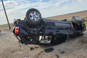Compartiendo dos imágenes donde se ve a un grupo de personas detenidas y la de una camioneta de color negro totalmente volteada.