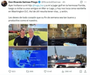 “Ayer invitaron a mi hijo Hugo Salinas Sada y a mí a jugar golf en la hermosa Florida, luego a visitar a unos amigos en Mar-a-Lago, y hoy nos toca cena navideña en Washington D.C. Así de útil resulta tener visa… y avión. Les deseo de todo corazón que su fin de semana sea tan bueno y productivo como el nuestro”, escribió.
