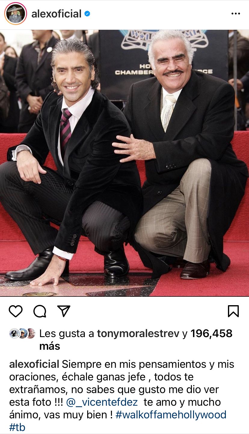 «Siempre en mis pensamientos y mis oraciones, échale ganas jefe, todos te extrañamos, no sabes que gusto me dio ver esta foto!! Vicente Fernández te amo y mucho ánimo, vas muy bien», esas fueron las palabras escritas en la cuenta de Instagram de alejandro Fernández y es que ya son más de dos meses desde que su papá, «Chente» Fernández, permanece internado en un hospital de Guadalajara en donde sigue en terapia intensiva sin mayores avances en su salud, pero de igual forma sin agravarse su situación, cosa que sus médicos celebran.