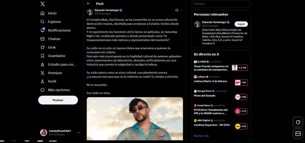 «Este personaje afirma que no somos animales, pero se comporta como tal. Dice que el ICE es salvaje, mientras su música promueve lo más salvaje del instinto: sin orden, sin belleza y sin responsabilidad. Eso ya no es una cuestión de gustos, es basura. Y sí, estoy hablando del Conejito Malo. Su ruido es basura tóxica», escribió Eduardo en Twitter.