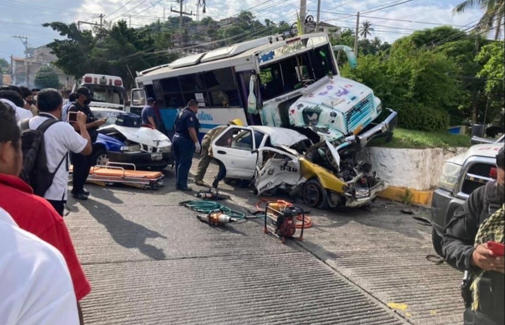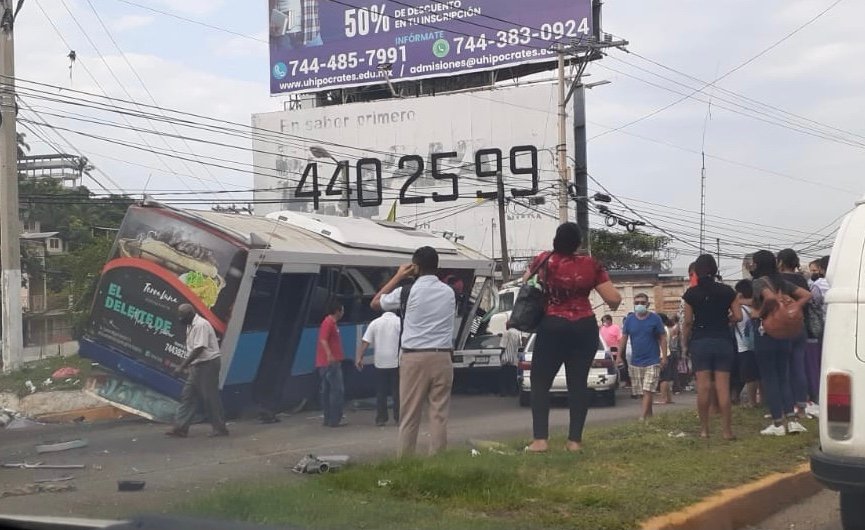 Hoy miércoles 28 de junio por la mañana, un sujeto desconocido abordó un camión urbano que cubre la ruta Costera-Renacimiento en el Puerto de Acapulco y a la altura del punto conocido como la Llave de Agua se levantó de su asiento y le disparo en dos ocasiones al chofer de la unidad, por lo que el transporte público se salió de control saltándose el camellón central y al caer en el sentido contrario al que iba impactó de lleno con dos taxis, uno Amarillo de los conocidos como Colectivos con la ruta de Cd. Renacimiento y otro azul con blanco, dejando como saldo varias personas heridas. Hasta el momento de la publicación las autoridades no habían emitido un parte oficial del percance.