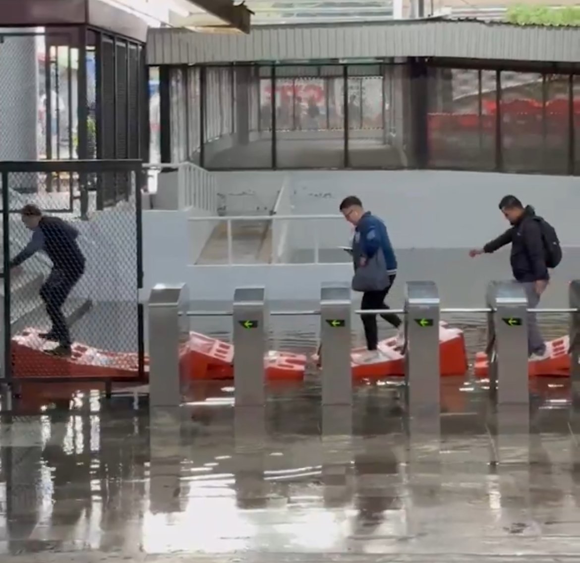 El encharcamiento se encuentra cerca de las escaleras y de las taquillas, por lo que los usuarios deben sostenerse de los torniquetes para evitar caerse.