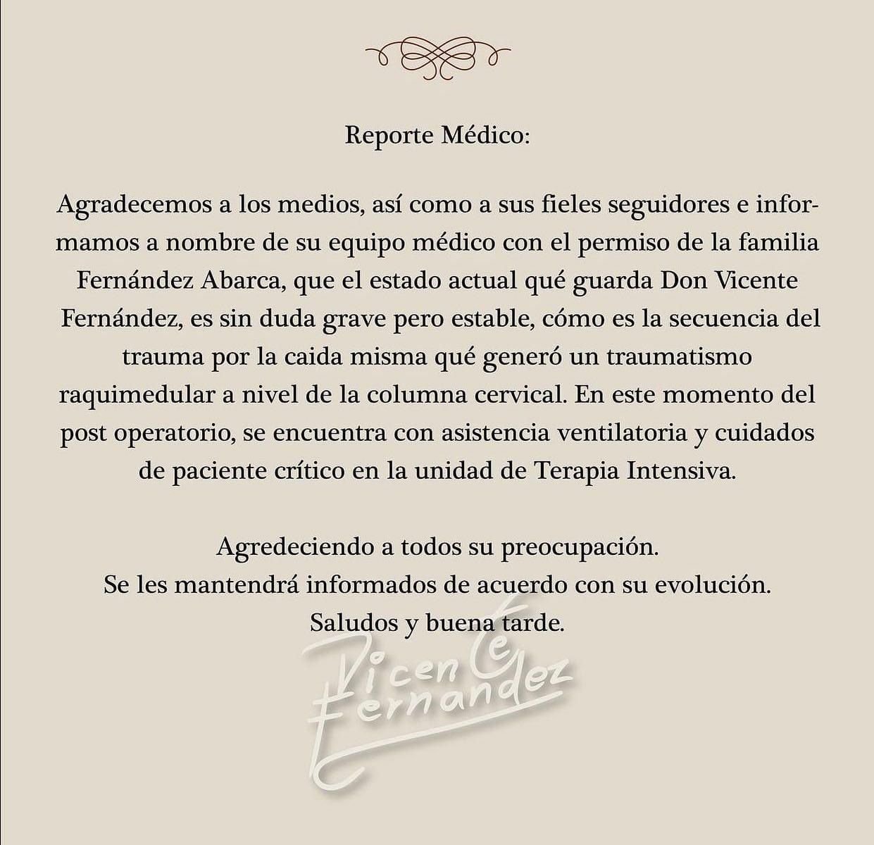 Cabe recordar que Vicente Fernández sufrió una caída en su recámara del Rancho Los Tres Potrillos el pasado viernes, por lo que tuvo que ser intervenido quirúrgicamente de emergencia ese mismo día, ya que presentaba una seria lesión en las cervicales, operación de la que se dijo tuvo resultados satisfactorios, pero que por su gravedad, se tenía que esperar para saber su evolución.