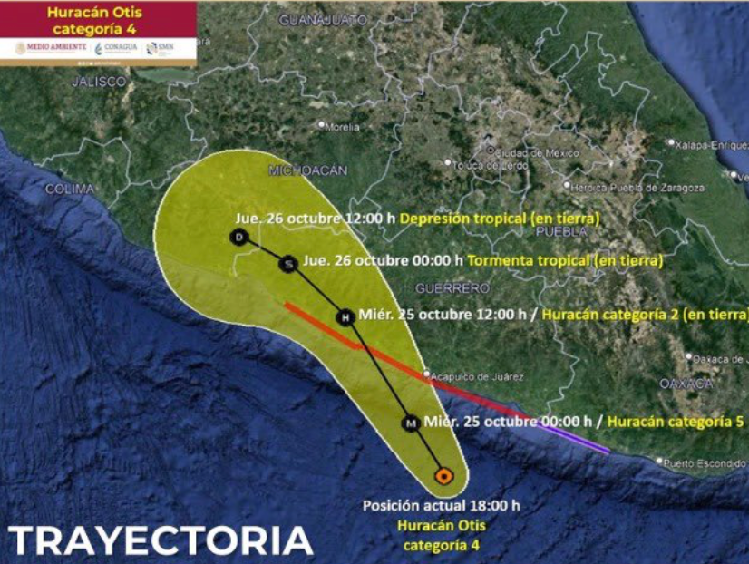 El huracán Otis alcanzó la categoría 4 frente a las costas de Guerrero con vientos máximos sostenidos de 230 kilómetros por hora y rachas de 280 kilómetros por hora y se prevé que alcance categoría 5 previo al impacto.