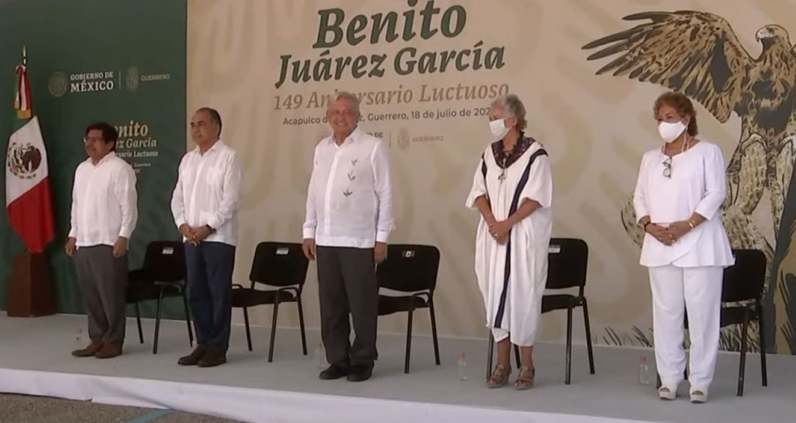 El presidente de la República Mexicana, Andrés Manuel López Obrador, encabezó este domingo el acto alusivo al 149 aniversario luctuoso de Benito Juárez García, en el Malecón de Acapulco, hasta donde se dieron cita diversos grupos de personas que realizaban protestas sobre temas como: salarios, seguridad en la pandemia y deficiencias en el deporte.