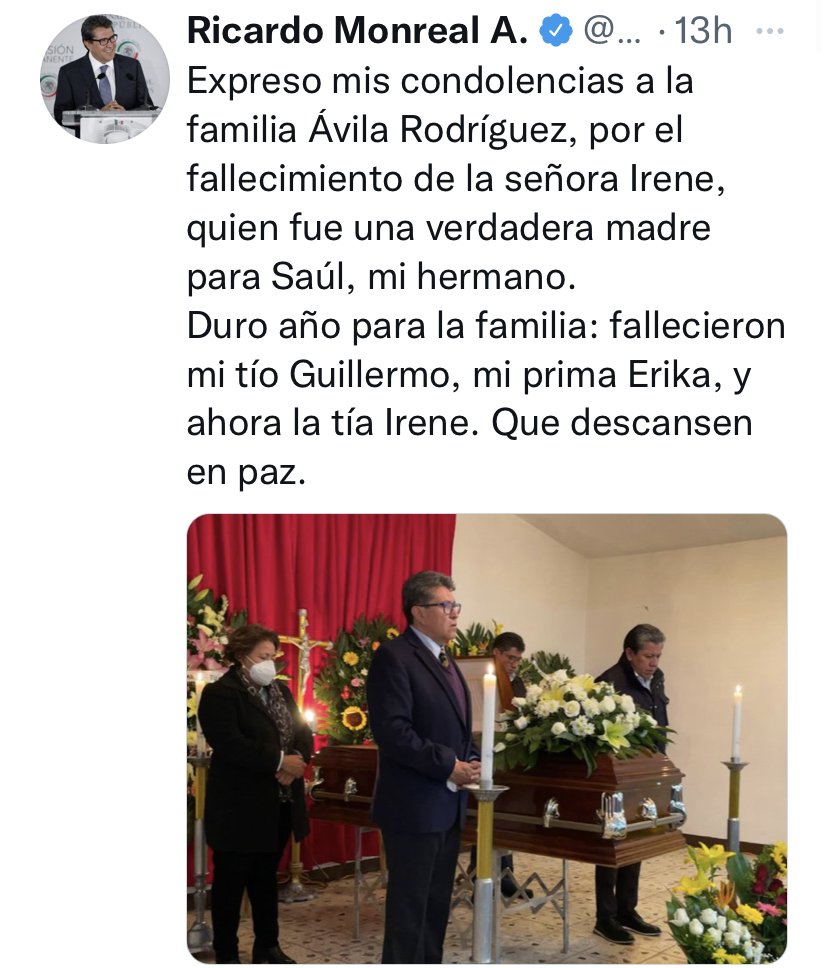 El Senador Ricardo Monreal Ávila participó en los servicio funerarios de la señora Irene Rodríguez, quien fue una persona muy cercana e importante en su vida y en la de sus hermanos, por lo que a través de sus redes sociales expresó su sentir ante la irreparable pérdida: «Expreso mis condolencias a la familia Ávila Rodríguez, por el fallecimiento de la señora Irene, quien fue una verdadera madre para mi hermano. Duro año para la familia: fallecieron mi tío Guillermo, mi prima Erika, y ahora la tía Irene. Que descansen en paz».