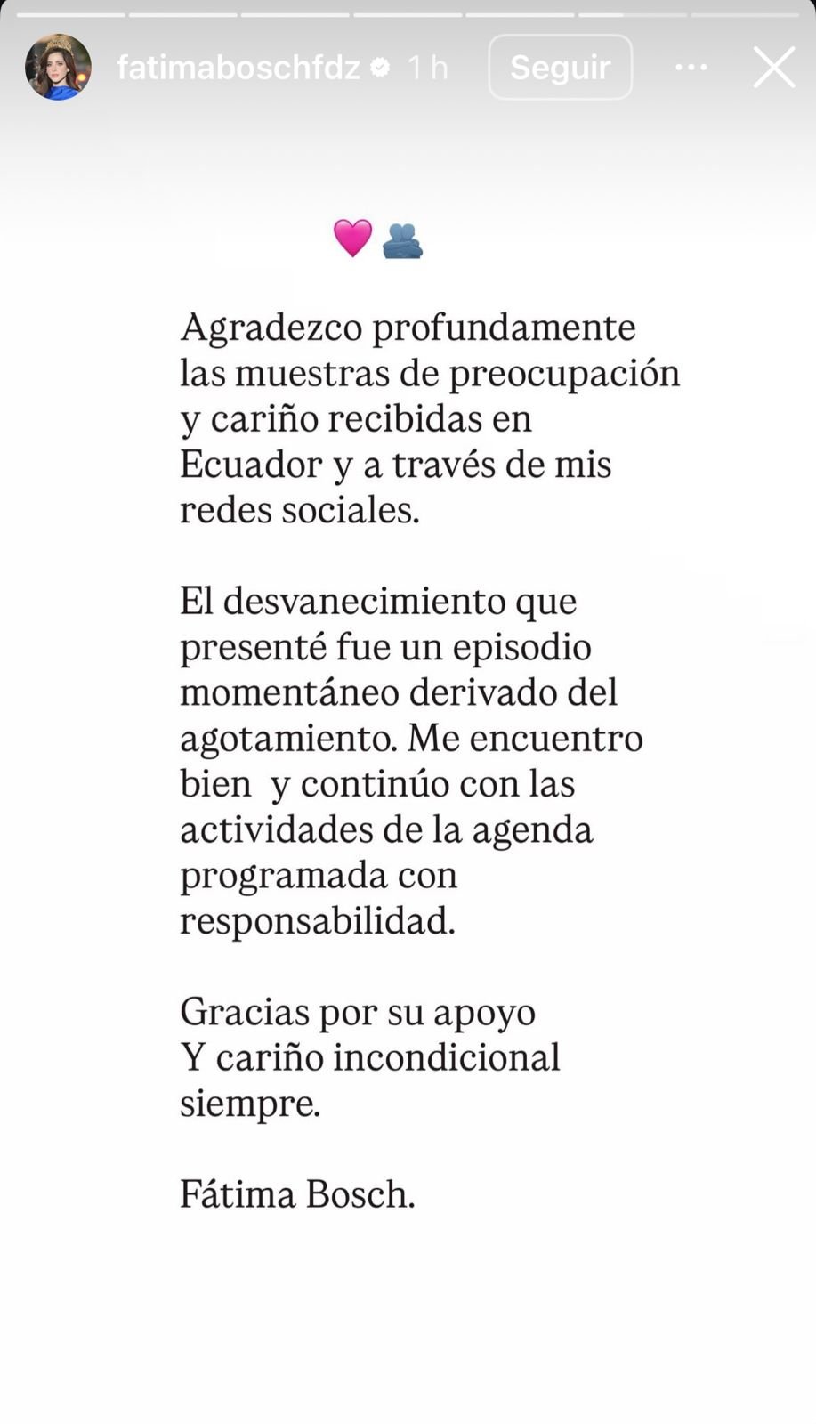 Horas después del incidente, la propia Fátima Bosch rompió el silencio a través de sus redes sociales. En un mensaje dirigido a sus seguidores, explicó que el episodio se debió al agotamiento derivado de su agenda oficial.