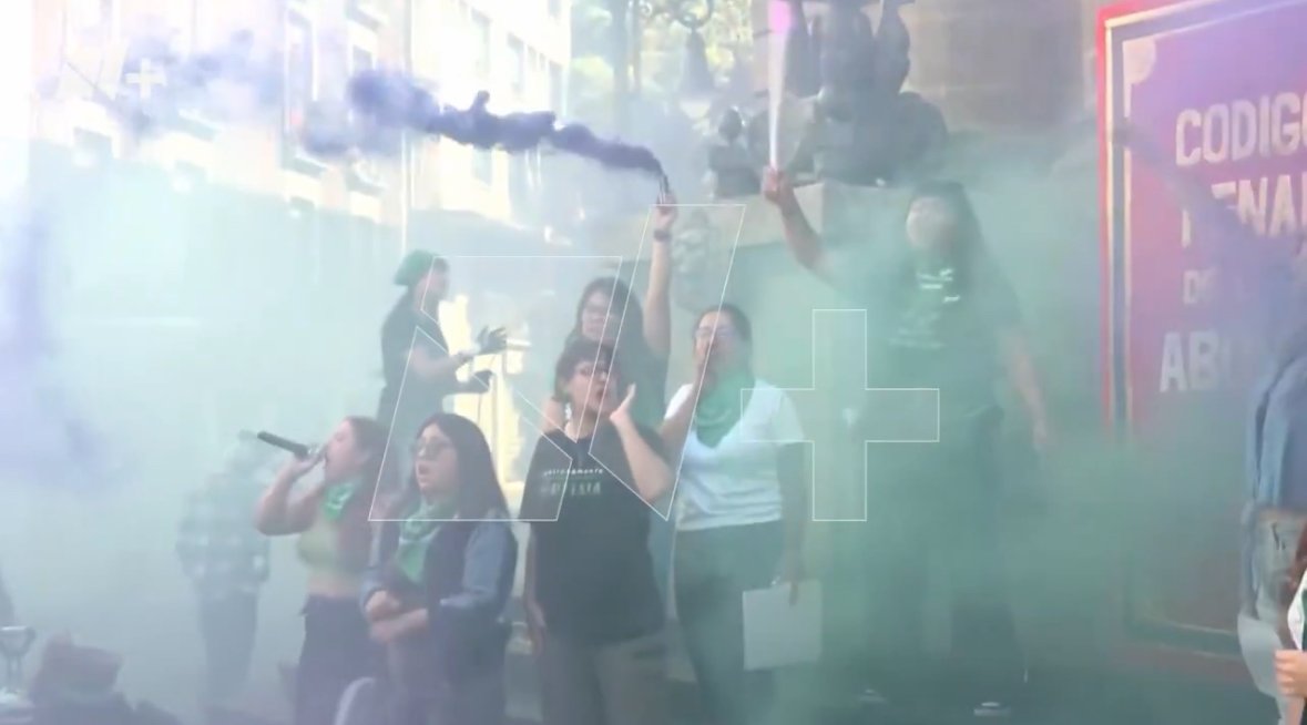 Al grito de “Aborto sí, aborto no, eso lo decido yo”, un grupo de feministas realizan una protesta a favor del aborto en las escaleras de acceso al Congreso de la Ciudad de México, donde incluso han prendido bengalas de humo de colores alusivos a su movimiento.