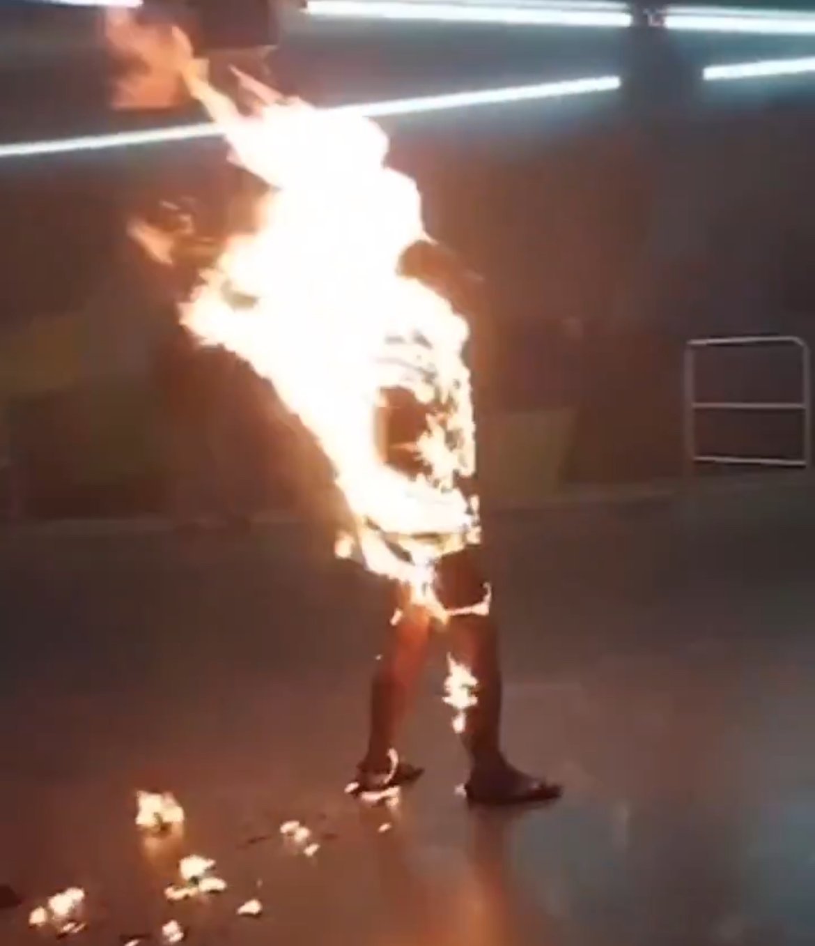 En las imágenes se observa al hombre cuando está encendido y ya después con el fuego extinguido y al parece está a punto de colapsar.