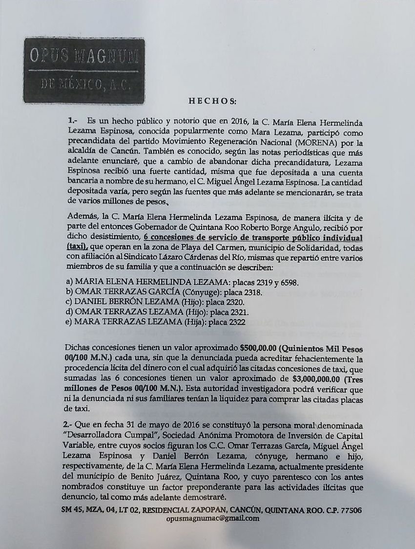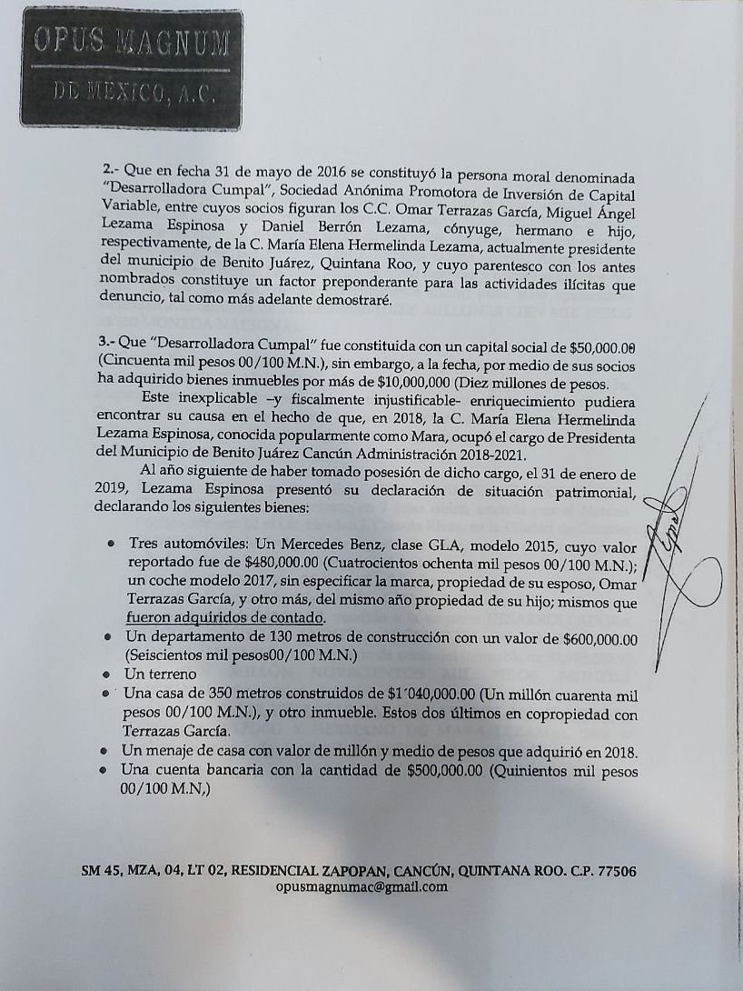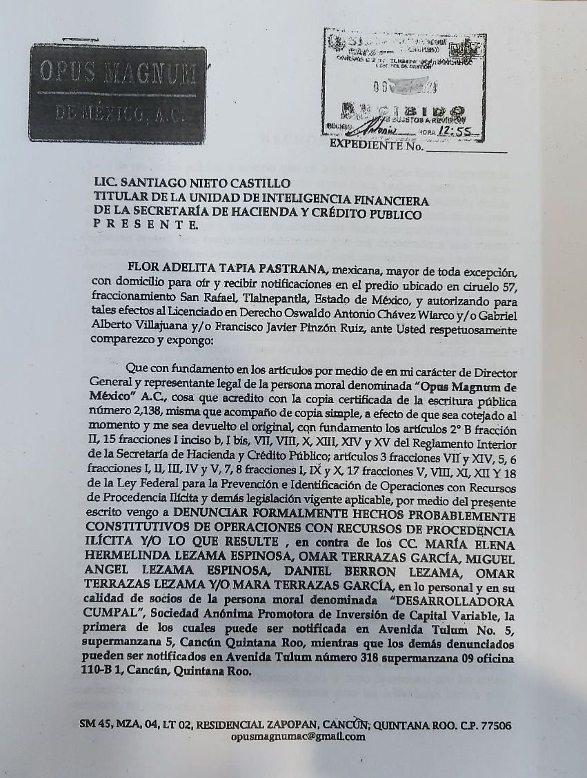 La denunciante también han solicitado al Sistema de Administración Tributaria (SAT) que se investigue el probable fraude fiscal de la empresa Desarrolladora Cumpal, de la familia Lezama, por las operaciones realizadas del subvalúo de los predios que han adquirido.