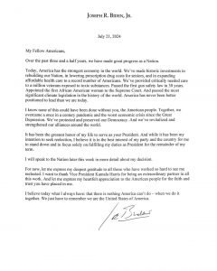 Menciona que ha sido un honor ser el presidente y aunque buscaba la reelección, se dio cuenta que lo mejor  para su partido es hacerse a un lado. En su carta agradece a toda la gente que le dio su apoyo al igual que a su Vicepresidenta Kamala Harris.