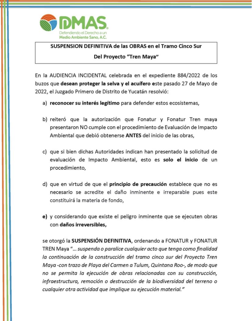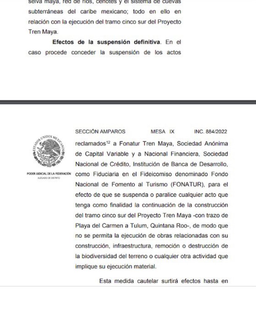 Después de un mes de litigios, el día de hoy un juez de Distrito de Yucatán concedió una suspensión definitiva para detener las obras del Tramo 5 Sur del Tren Maya.