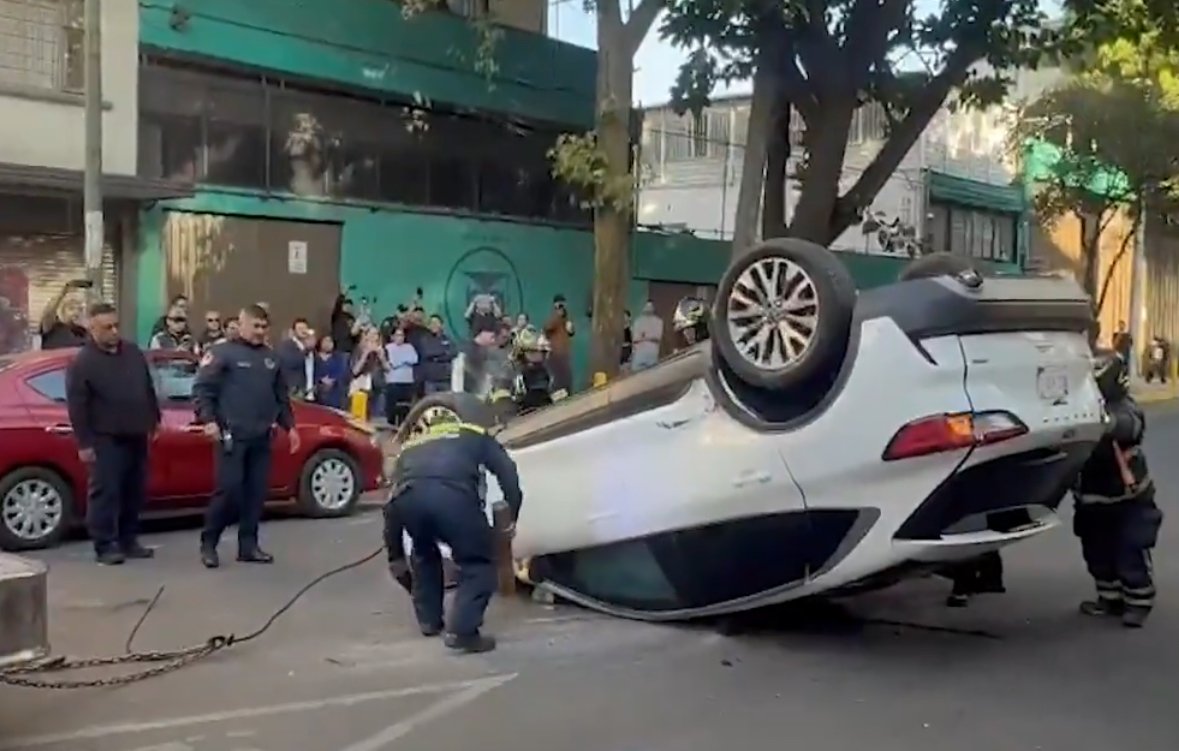 Una camioneta que aparentemente era conducido a exceso de velocidad se hinca la mañana de este sábado sobre la calle Puebla, al cruce con Tampico, en la colonia Roma, alcaldía Cuauhtémoc, en la Ciudad de México.