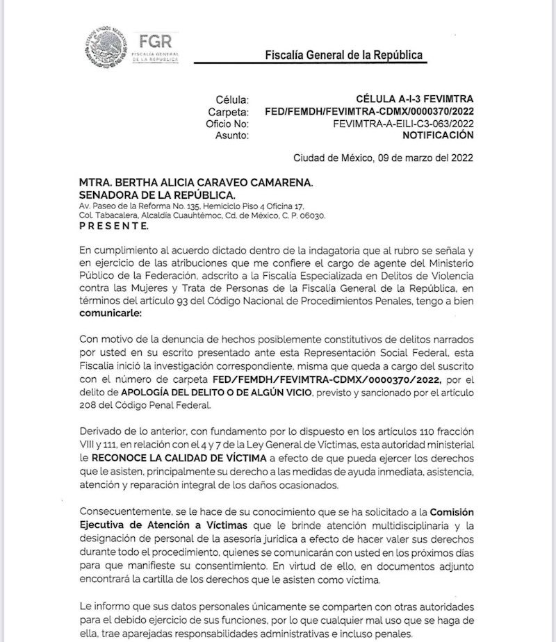 Según la senadora, sería por el delito de Apología del delito en su contra, por lo que compartió u mensaje en su cuenta personal de twitter:«La FGR me notificó que se ha abierto una carpeta de investigación en contra de Chumel Torres, al tiempo que me reconoce la calidad de víctima de conformidad con la Ley general de Víctimas por su violencia machista. Seguiré adelante hasta que la dignidad de haga costumbre»