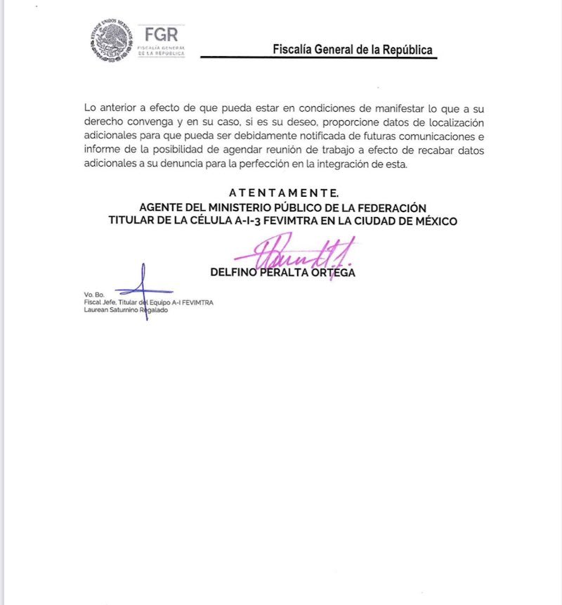La legisladora dio a conocer un documento donde la FGR le notifica que abrió una carpeta de investigación en contra de José Manuel Torres Morales, conocido como Chumel Torres, debido a agresiones verbales con que este se refirió a la senadora en una emisión de su programa de internet.