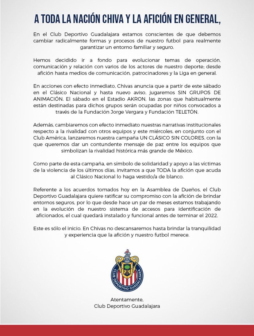 Por medio de un comunicado, el equipo jalisciense compartió su decisión de implementar cambios radicales para garantizar un entorno familiar y seguro.