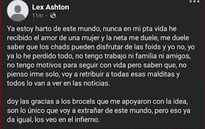 Horas antes, Ashton había publicado en Facebook —desde una cuenta creada ese mismo día— fotos mostrando la ropa y las armas que usaría, además de mensajes en foros y chats en los que dejó constancia de su frustración, expresiones misóginas y alusiones a la subcultura “incel” (célibes involuntarios). En uno de sus escritos afirmó: “Ya estoy harto de este mundo, nunca he recibido el amor de una mujer… me duele saber que los Chads pueden disfrutar y yo no”, empleando el término “Chad” para referirse a hombres considerados atractivos o populares.