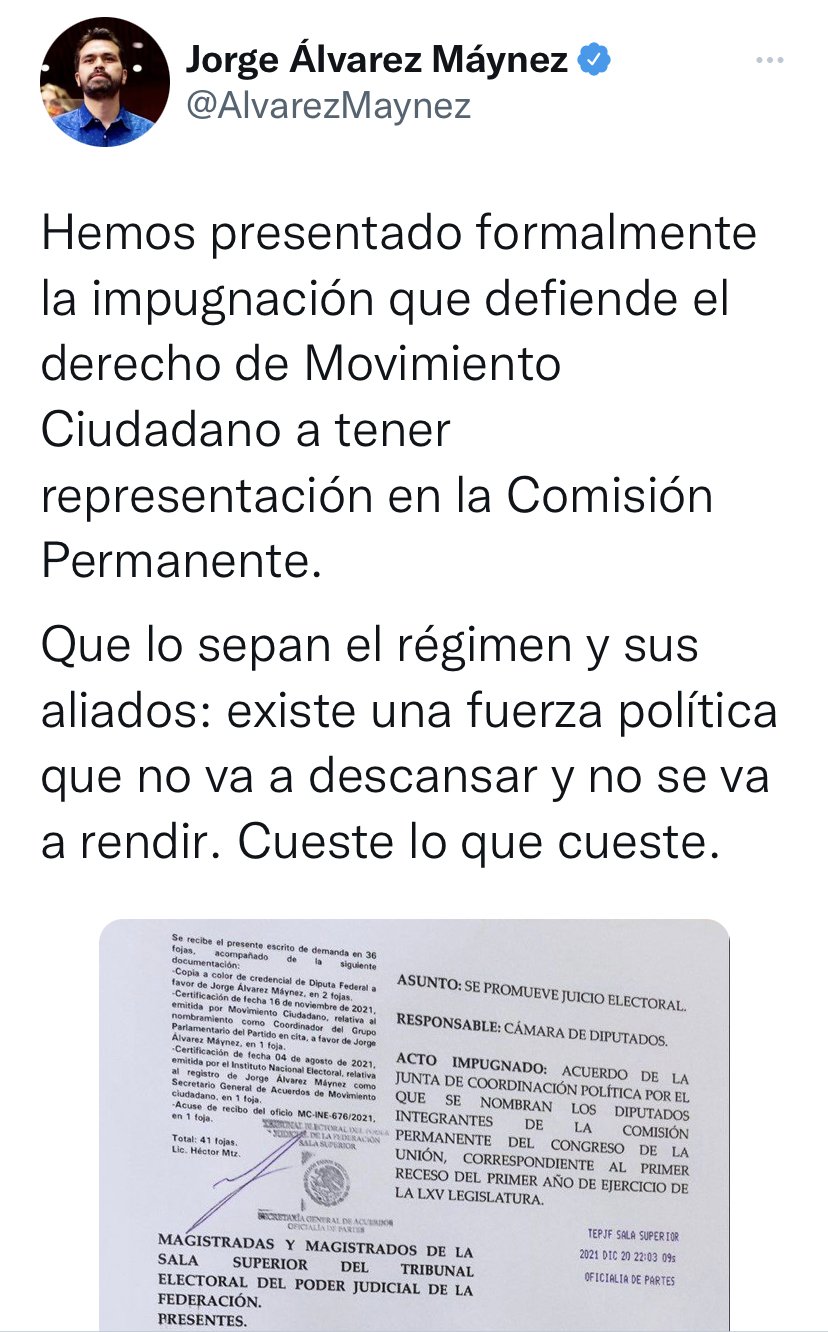 “Que sepan el régimen y sus aliados: hay una fuerza política que No se detendrá y no se rendirá. Todo lo necesario”dijo el diputado Jorge Álvarez Máynez en un mensaje, el cual acompañó con una fotografía del recurso de apelación presentado a TEPJF.