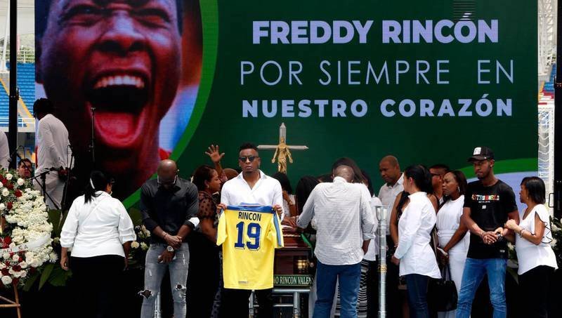El féretro de Rincón estuvo hoy desde las primeras horas de la mañana en un costado del estadio Pascual Guerrero de Cali en donde familiares, amigos, jugadores, dirigentes y aficionados del fútbol acompañaron al exjugador del Real Madrid y del Nápoles italiano.