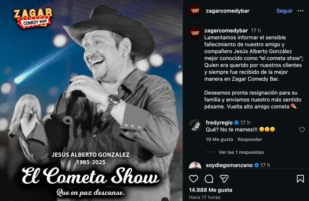 Se dio a conocer el fallecimiento de Jesús Alberto González, mejor conocido por su popular personaje “El Cometa Show”, ocurrido el 8 de diciembre de 2025. La noticia sorprendió a seguidores y colegas, quienes expresaron su tristeza y compartieron recuerdos del comediante en redes sociales.