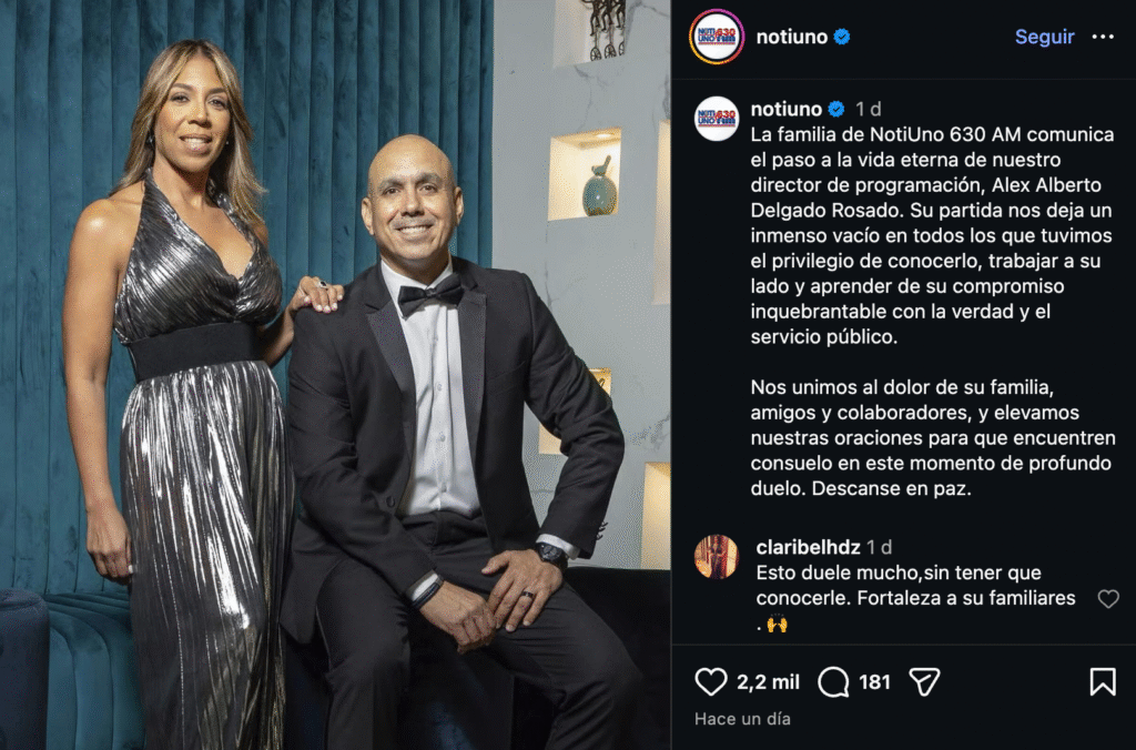 “La familia de NotiUno 630 AM comunica el paso a la vida eterna de nuestro director de programación, Alex Alberto Delgado Rosado. Su partida nos deja un inmenso vacío en todos los que tuvimos el privilegio de conocerlo, trabajar a su lado y aprender de su compromiso inquebrantable con la verdad y el servicio público”, señalaron.