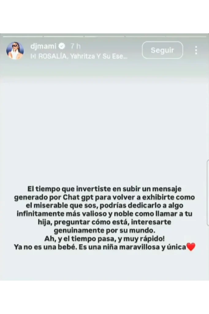 En su publicación, DJ Mami insinuó que el comunicado del cantante habría sido redactado con ayuda de inteligencia artificial y cuestionó su rol como padre. La referencia a la menor intensificó la conversación pública en torno a la responsabilidad parental y la exposición mediática del conflicto.