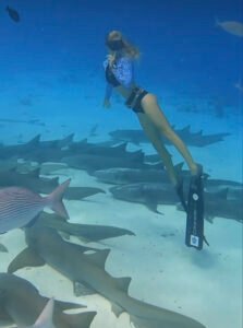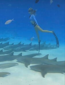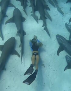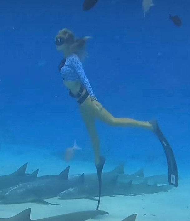 Una de las apneístas más res¿conocidas del mundo, gracias a sus destacados trabajos e investigaciones, Ocean Ramsey, quien es conocida como la reina de los Tiburones, sorprendió a todos los amantes del mar co un video en el que se le puede ver nadando cerca de un grupo de tiburones que parecen estar dormidos.