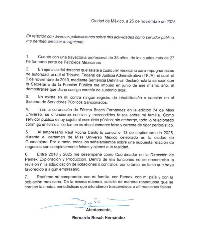 A través de un comunicado difundido este martes 25 de noviembre de 2025, Bosch Fernández reconoció su trayectoria de casi 30 años en la petrolera estatal, afirmó que no existen sanciones administrativas en su contra y dijo que está sujeto al escrutinio público.