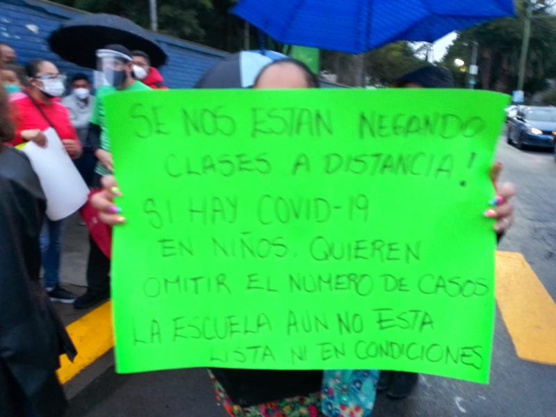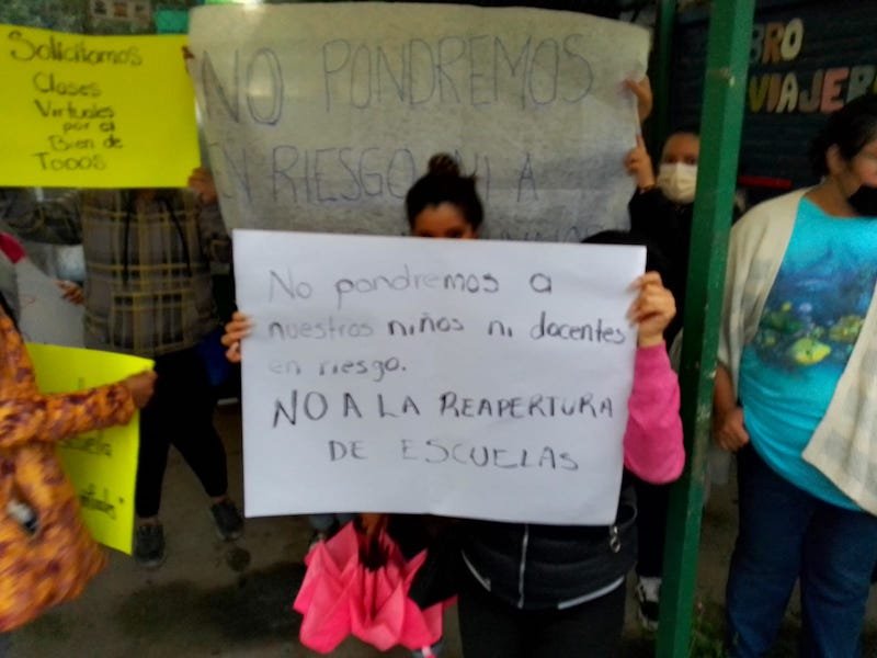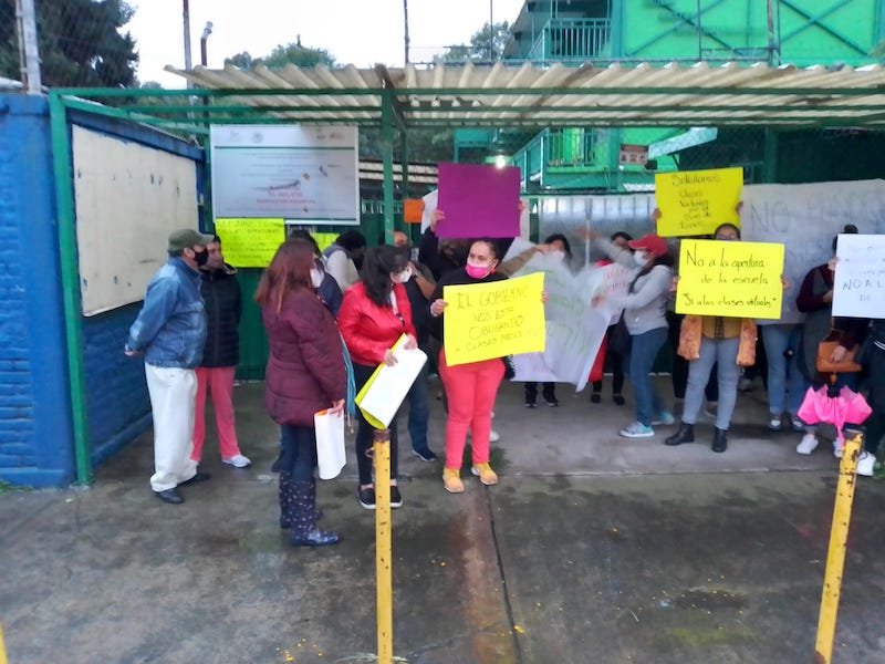 Madres y padres de familia de la escuela de tiempo completo «Amalia González Caballero», en la colonia El Rosario de Azcapotzalco, en la Ciudad de México, protestaron porque no hay condiciones sanitarias para que sus hijos regresen de manera presencial a clases, señalaron que el plantel no tienen agua ni energía eléctrica y que es una escuela en la que los alumnos están de las 08:00 horas a las 16:00 horas, por lo que no piensan poner en riesgo la salud de sus hijos con clases presenciales.