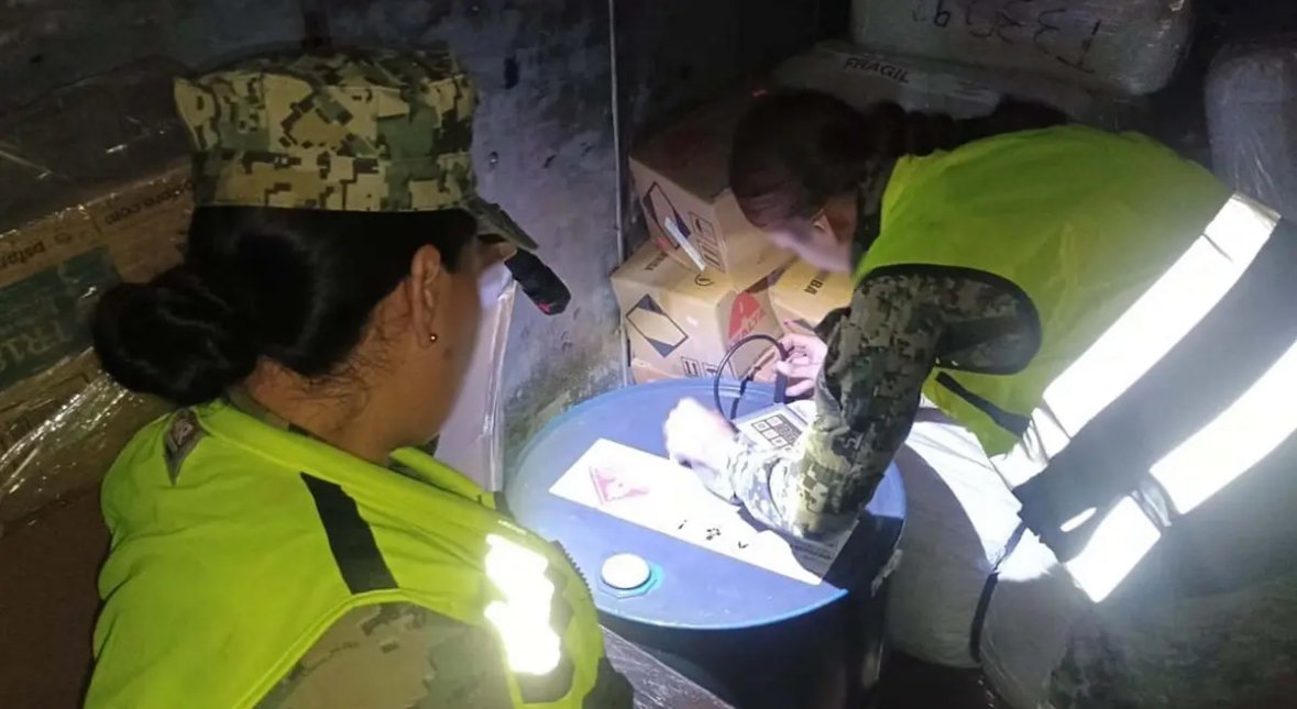 En él se localizaron seis cubetas y un tambo que contenían aproximadamente 314 litros de tolueno, sustancia catalogada como producto químico esencial, cuya naturaleza fue confirmada mediante equipo de identificación especializado.