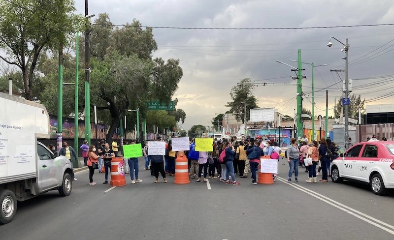 Reportan un bloque en Calzada Ermita Iztapalapa y ayuntamiento, en la Ciudad de México, el cual está realizado por profesoras que denuncian públicamente que no existen las condiciones sanitarias reales, ni para ellos, ni para los niños, que haga seguro el regreso a clases presenciales en guarderías e instancias infantiles de iztapalapa, asegurando que actualmente hay un gran riesgo de contagios de Covid-19, por lo que piden que se les proporcionan los materiales y equipo necesario para poder garantizar una estancia segura.