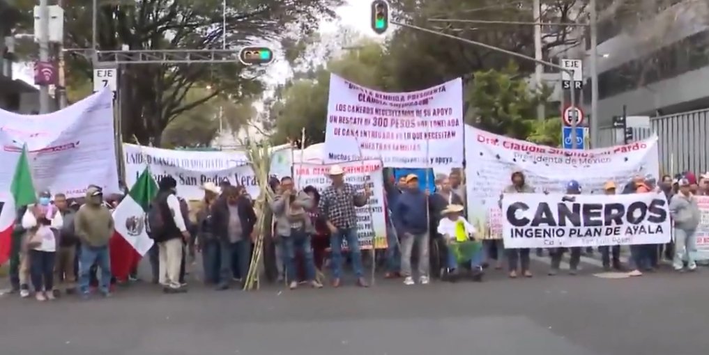 Un grupo de productores de caña de azúcar están bloqueándonos la avenida Municipio Libre y avenida Cuauhtémoc, frente a las instalaciones de la Secretaría de Agricultura, para denunciar el desplome de precios de sus productos agrícolas.